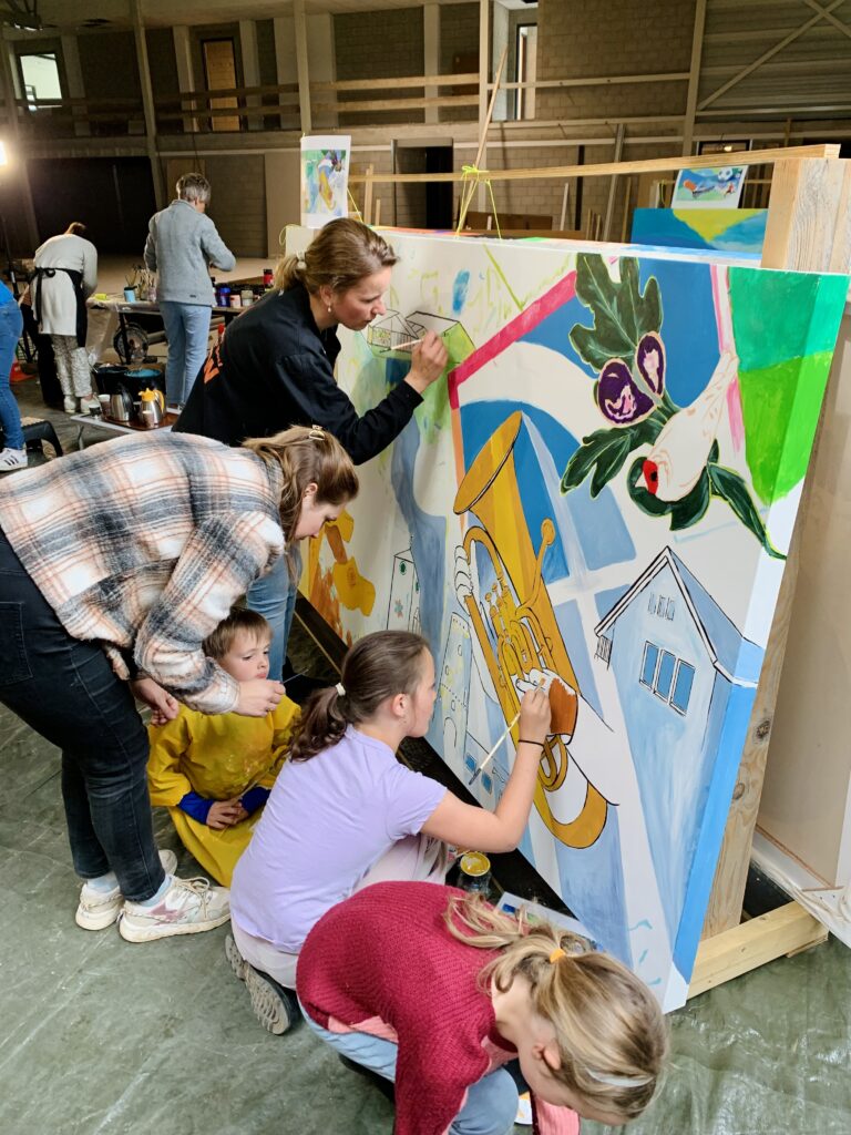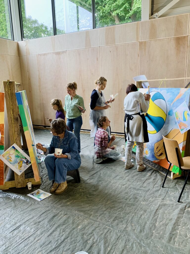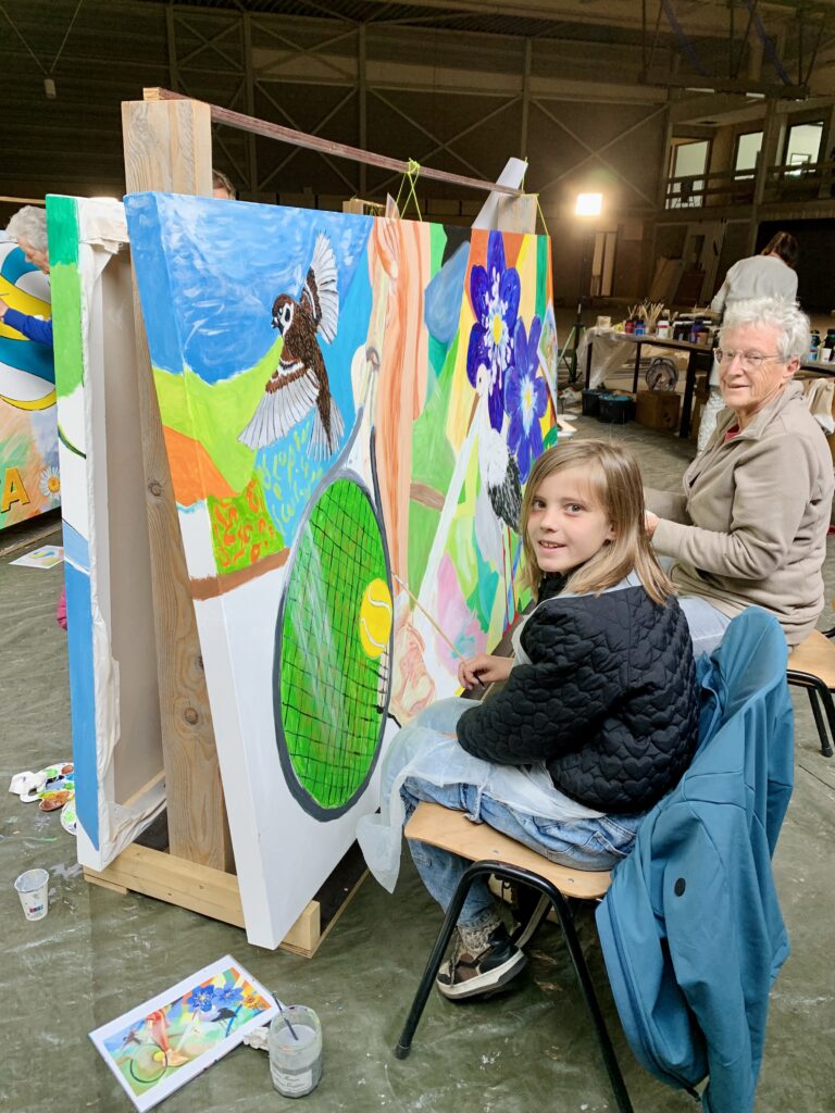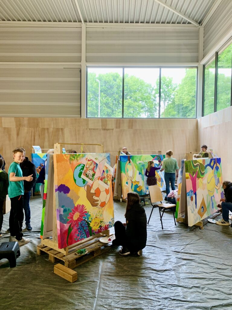 Samen kunst maken verbindt, net zoals samen sporten verbindt. Vanuit die gedachte is het nieuwe sportcomplex, als sport- en ontmoetingsplek, en schilderproject Onze Wereld Kleuren ontstaan. Mensen mochten ideeën voor het dorpsleven, sport en de omgeving met mij delen. Daarmee maakte ik vervolgens ontwerpen en zette deze in lijnen op zeven enorme canvasdoeken. Vervolgens kon iedereen die wilde de kwast pakken en mee schilderen: jong en oud, dorpelingen en nieuwkomers, mensen afkomstig uit verschillende milieus. Het waren drie prachtige schilderdagen met meer dan 100 deelnemers en nog meer belangstellenden – we leerden elkaar en onze creatieve talenten beter kennen. De doeken krijgen een prominente plek bij de ingang van het gebouw.