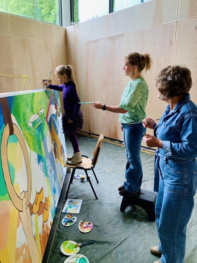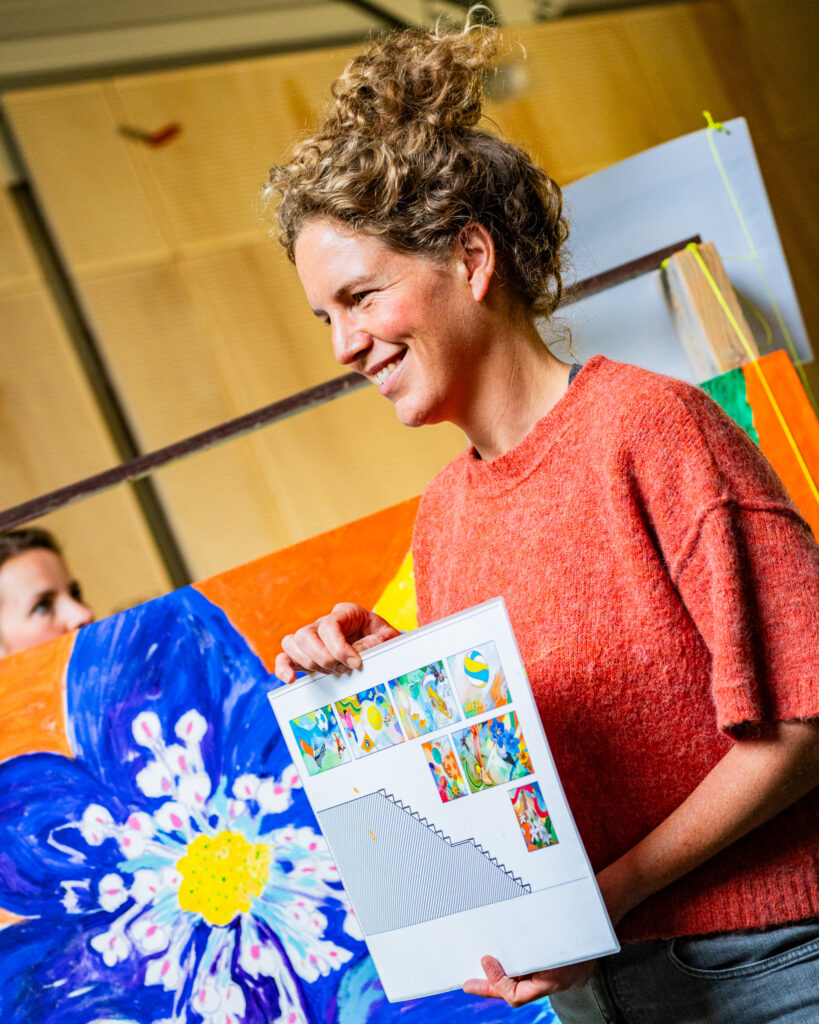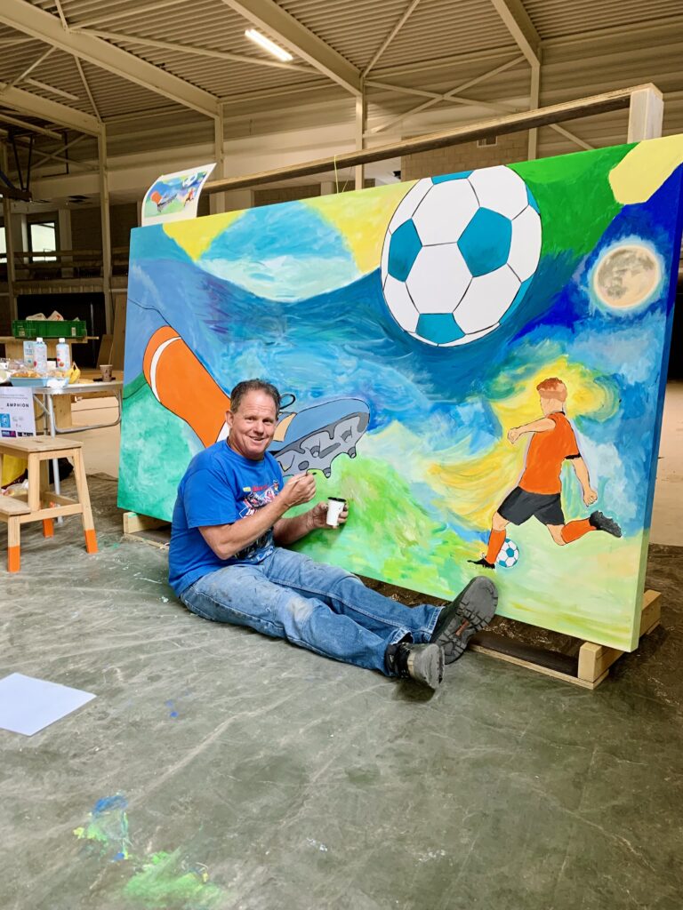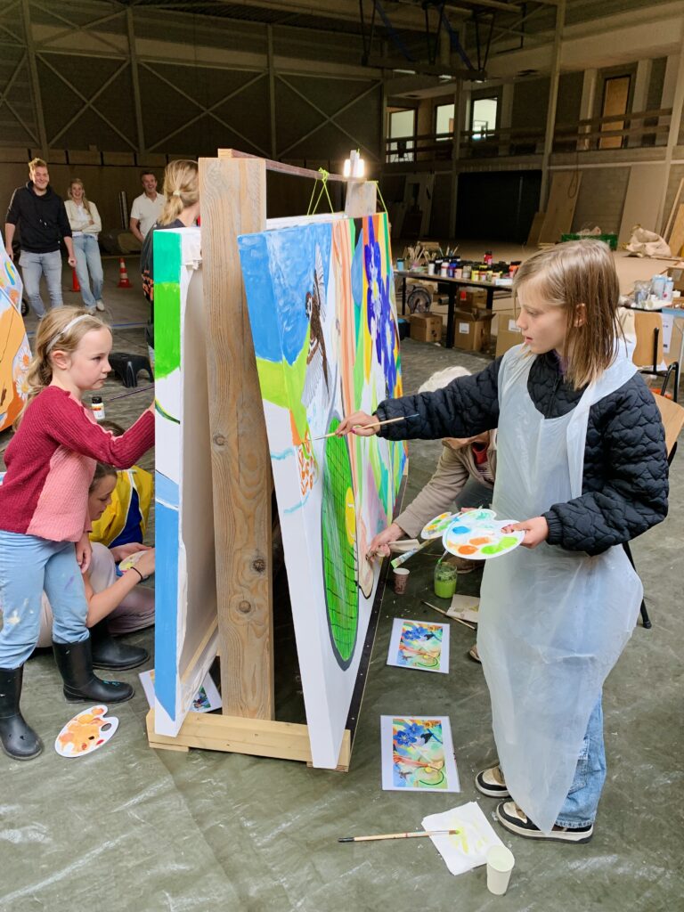 Samen kunst maken verbindt, net zoals samen sporten verbindt. Vanuit die gedachte is het nieuwe sportcomplex, als sport- en ontmoetingsplek, en schilderproject Onze Wereld Kleuren ontstaan. Mensen mochten ideeën voor het dorpsleven, sport en de omgeving met mij delen. Daarmee maakte ik vervolgens ontwerpen en zette deze in lijnen op zeven enorme canvasdoeken. Vervolgens kon iedereen die wilde de kwast pakken en mee schilderen: jong en oud, dorpelingen en nieuwkomers, mensen afkomstig uit verschillende milieus. Het waren drie prachtige schilderdagen met meer dan 100 deelnemers en nog meer belangstellenden – we leerden elkaar en onze creatieve talenten beter kennen. De doeken krijgen een prominente plek bij de ingang van het gebouw.