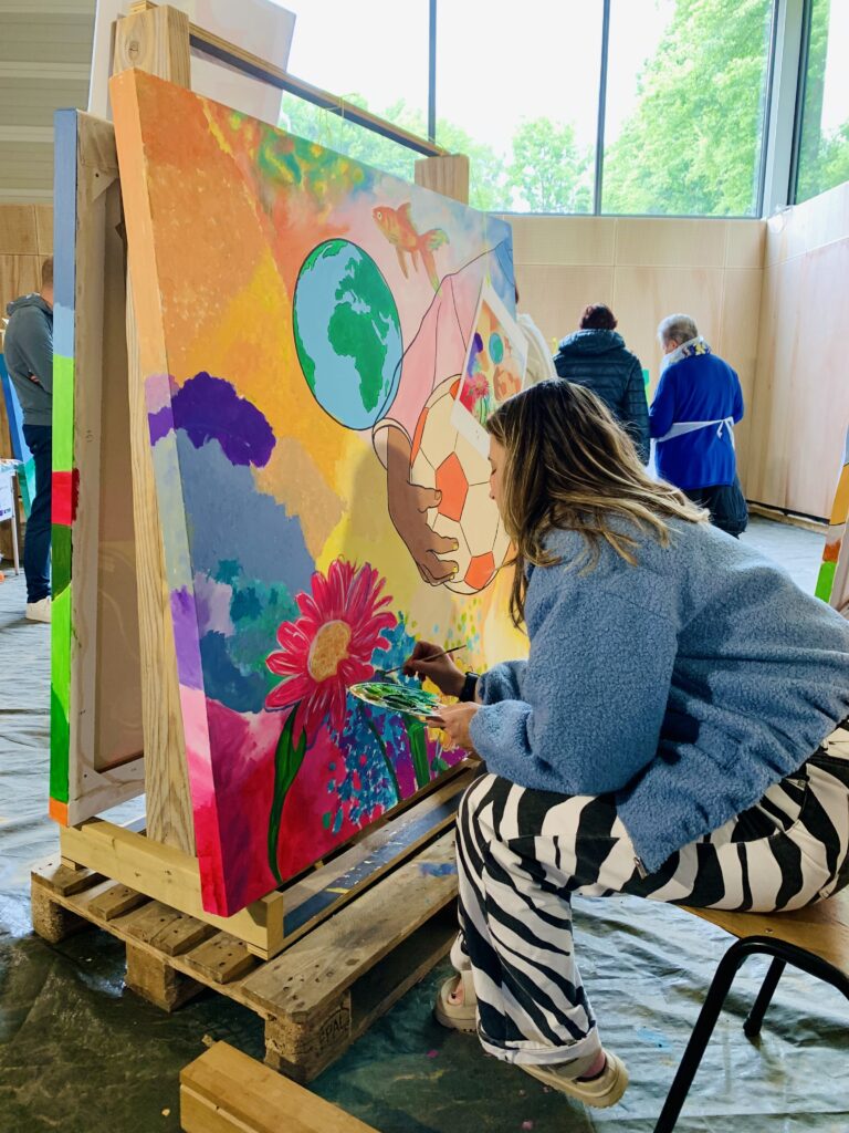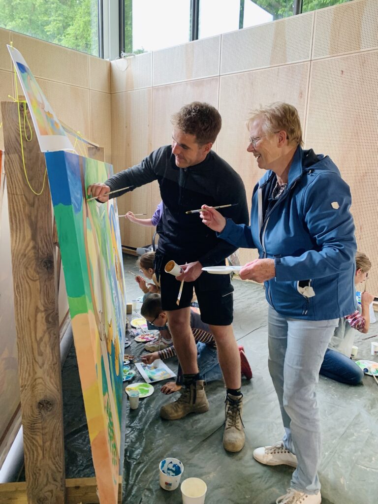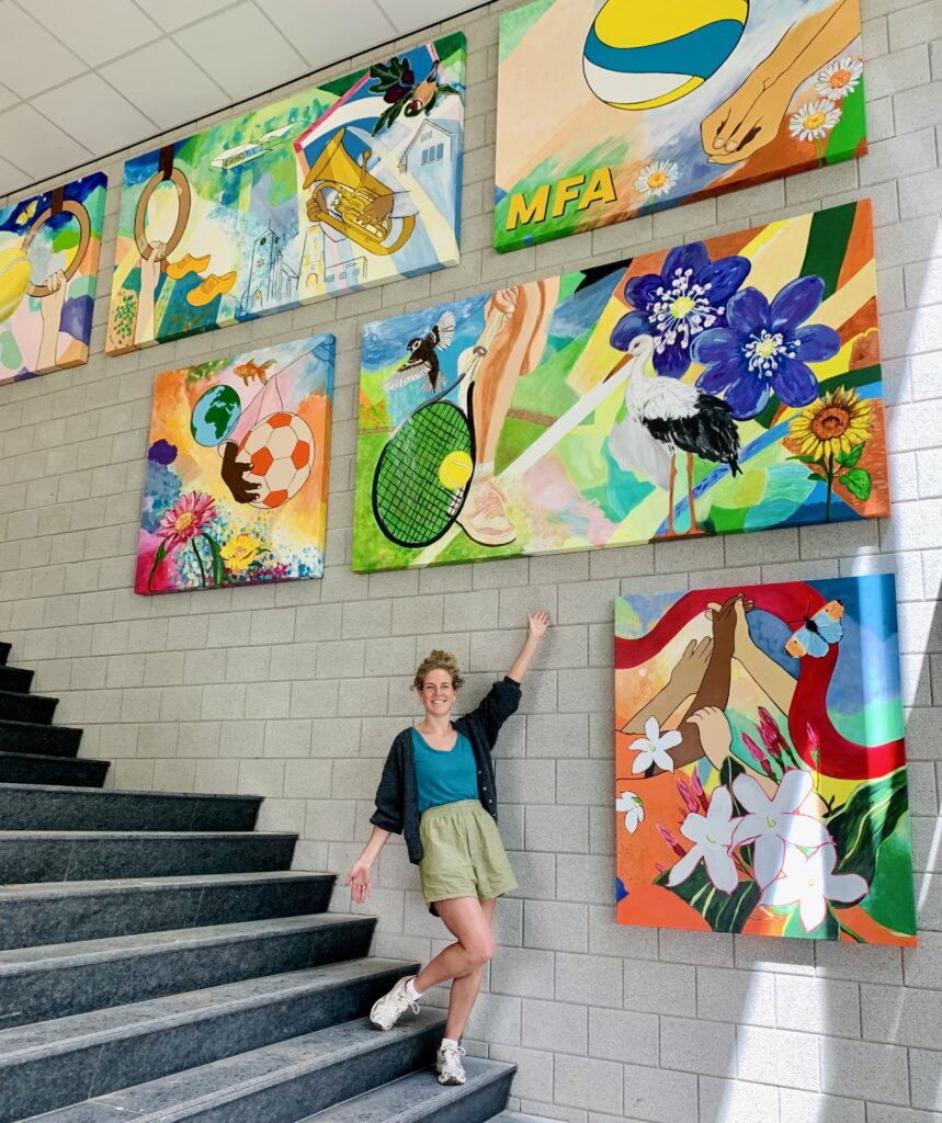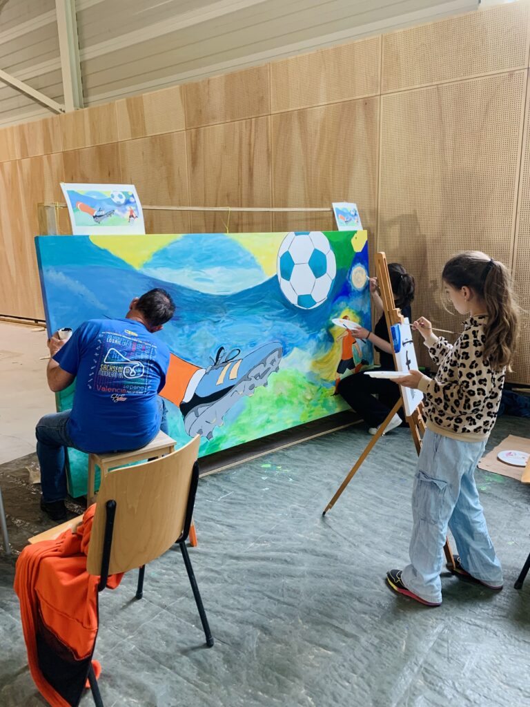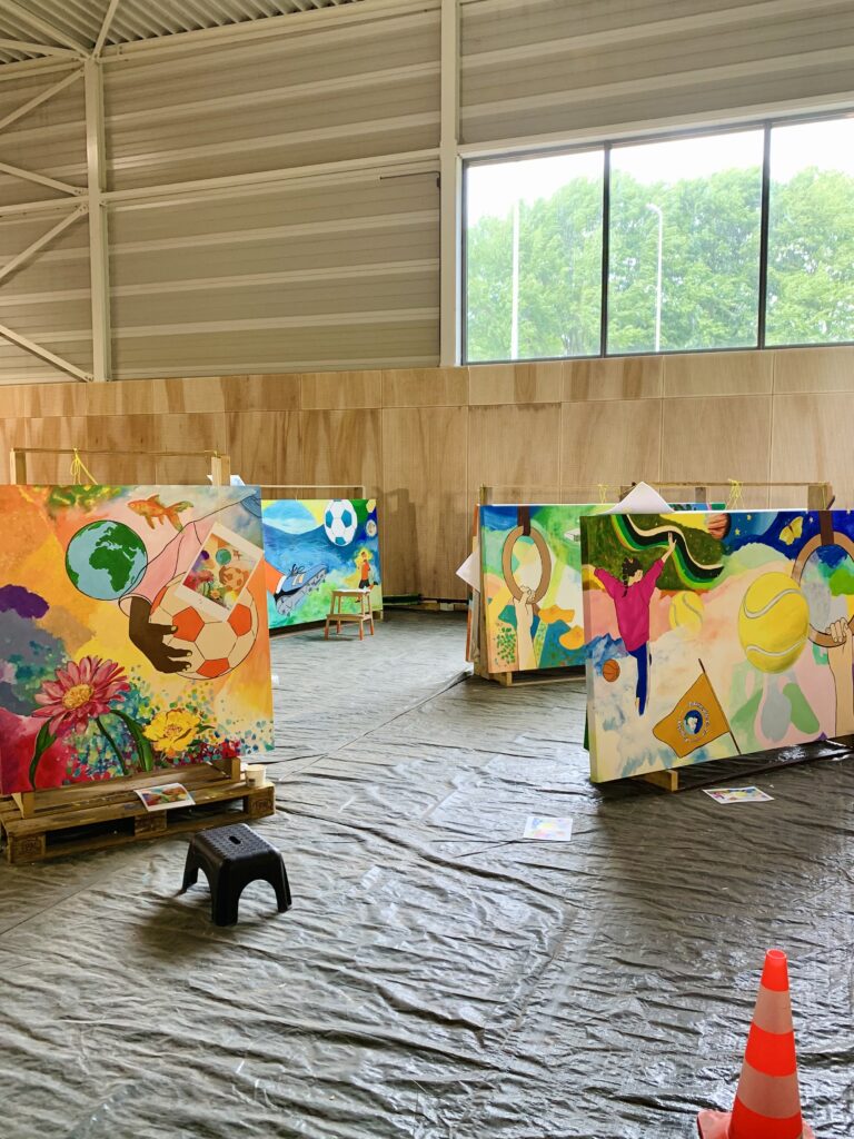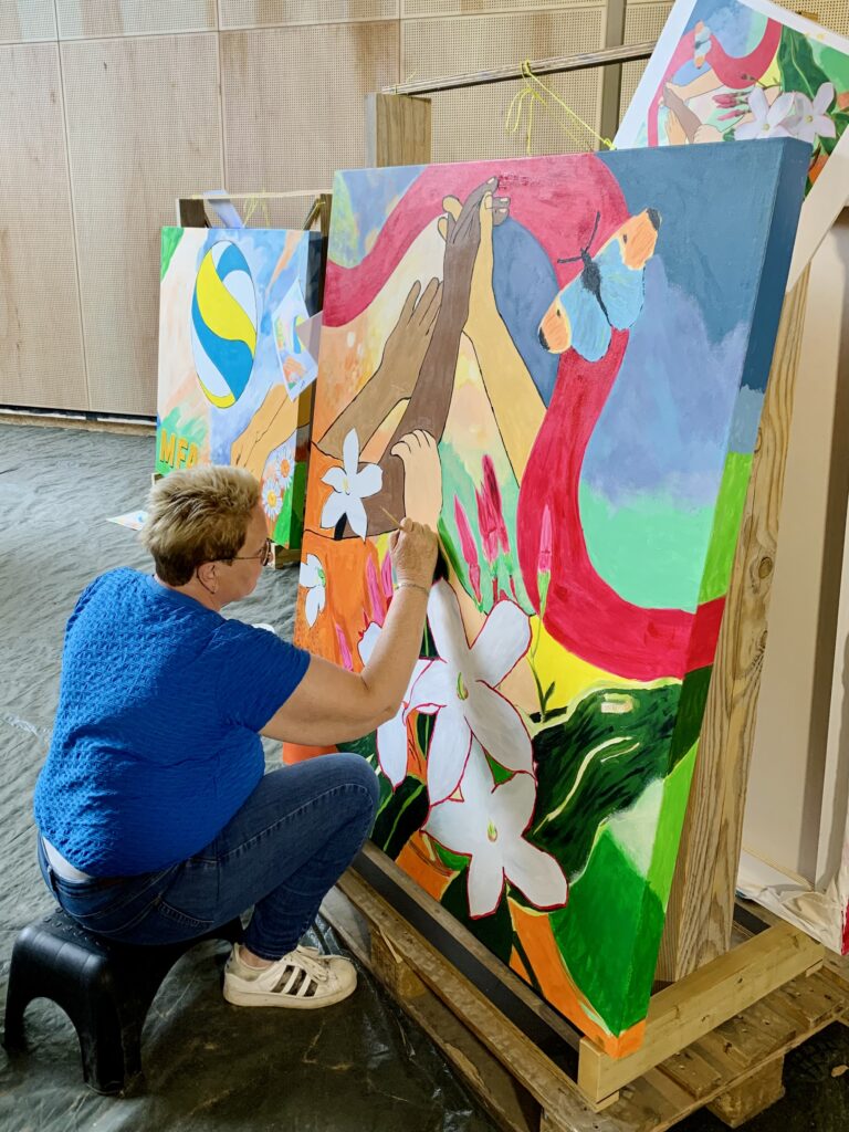 Creating art together connects, just as playing sports together connects. This idea led to the creation of the new sports complex – to sport, meet and connect – and the painting project Coloring Our World. People were asked to share ideas about village life, sports and the environment with me. I used these thoughts to make designs and put them in lines on seven enormous canvases. Then everyone who wanted could pick up a brush and paint along: young and old, villagers and newcomers, people from different backgrounds. These were three wonderful painting days with over 100 participants and even more interested visitors – we got to know each other and our creative talents better. The canvases will be given a prominent place at the entrance of the building.