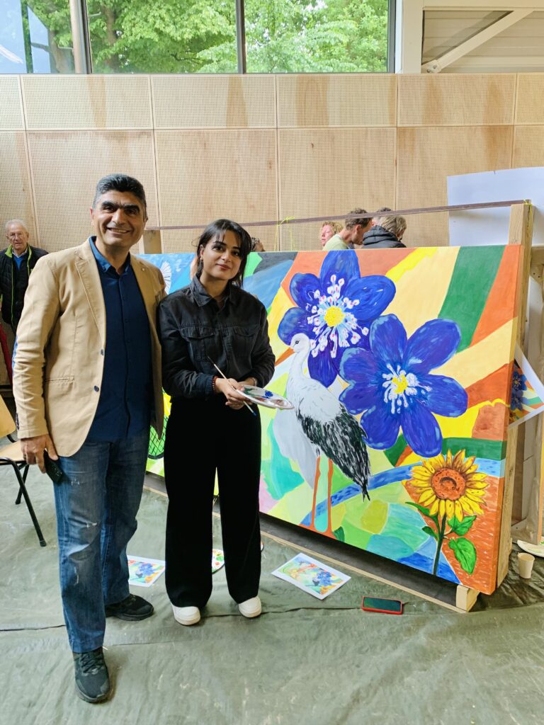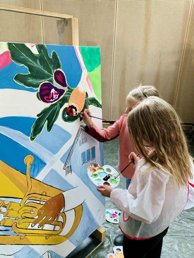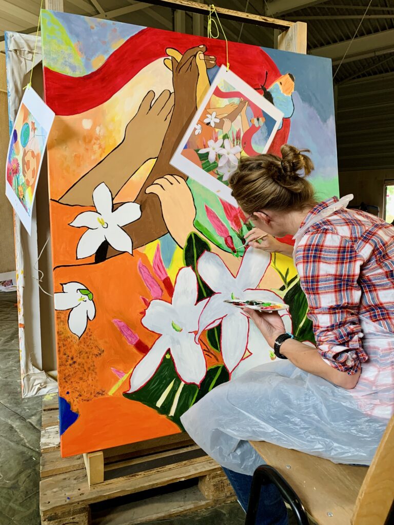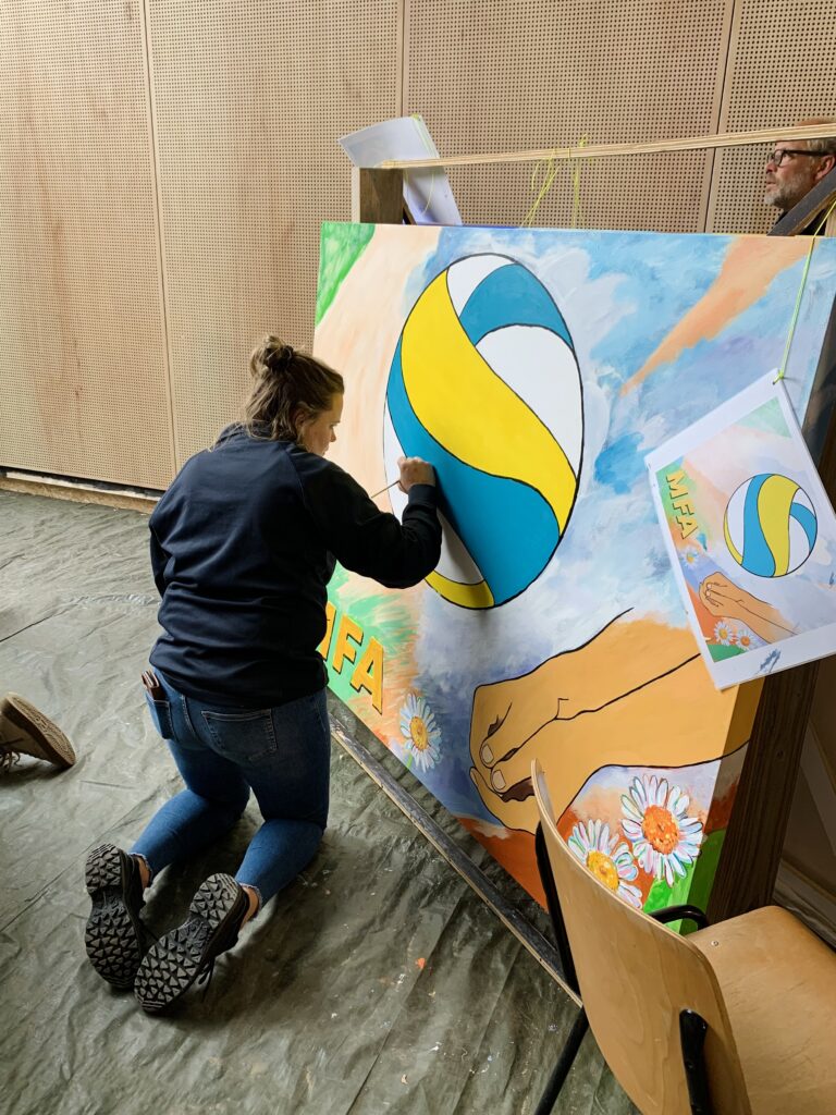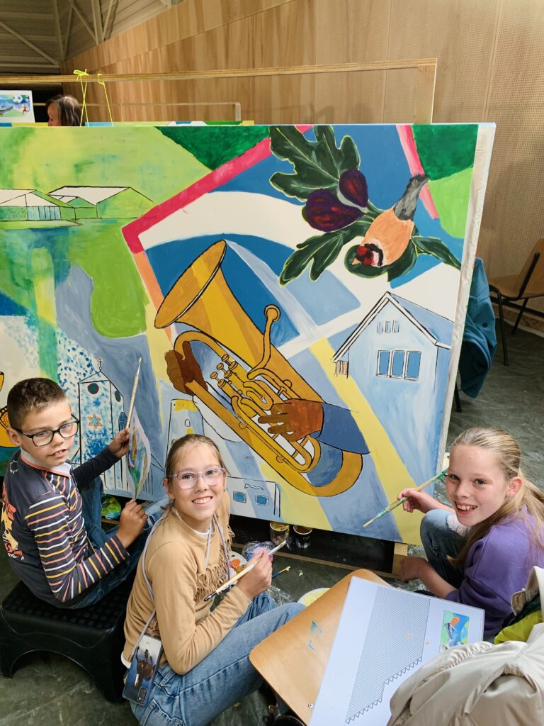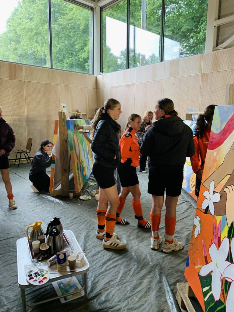 Creating art together connects, just as playing sports together connects. This idea led to the creation of the new sports complex – to sport, meet and connect – and the painting project Coloring Our World. People were asked to share ideas about village life, sports and the environment with me. I used these thoughts to make designs and put them in lines on seven enormous canvases. Then everyone who wanted could pick up a brush and paint along: young and old, villagers and newcomers, people from different backgrounds. These were three wonderful painting days with over 100 participants and even more interested visitors – we got to know each other and our creative talents better. The canvases will be given a prominent place at the entrance of the building.