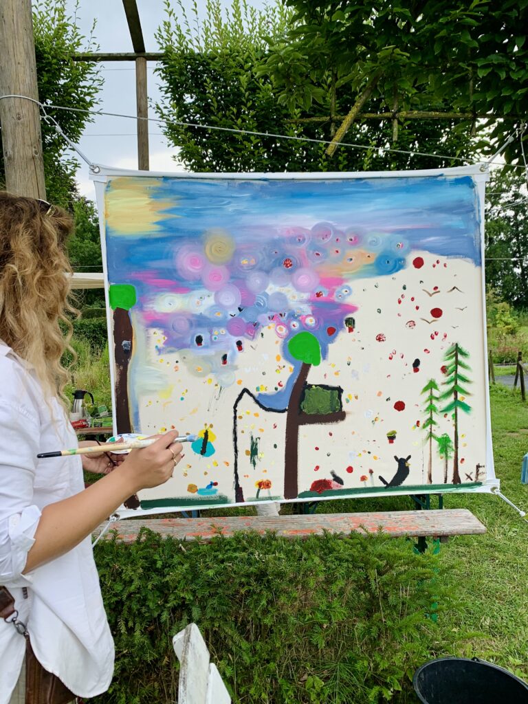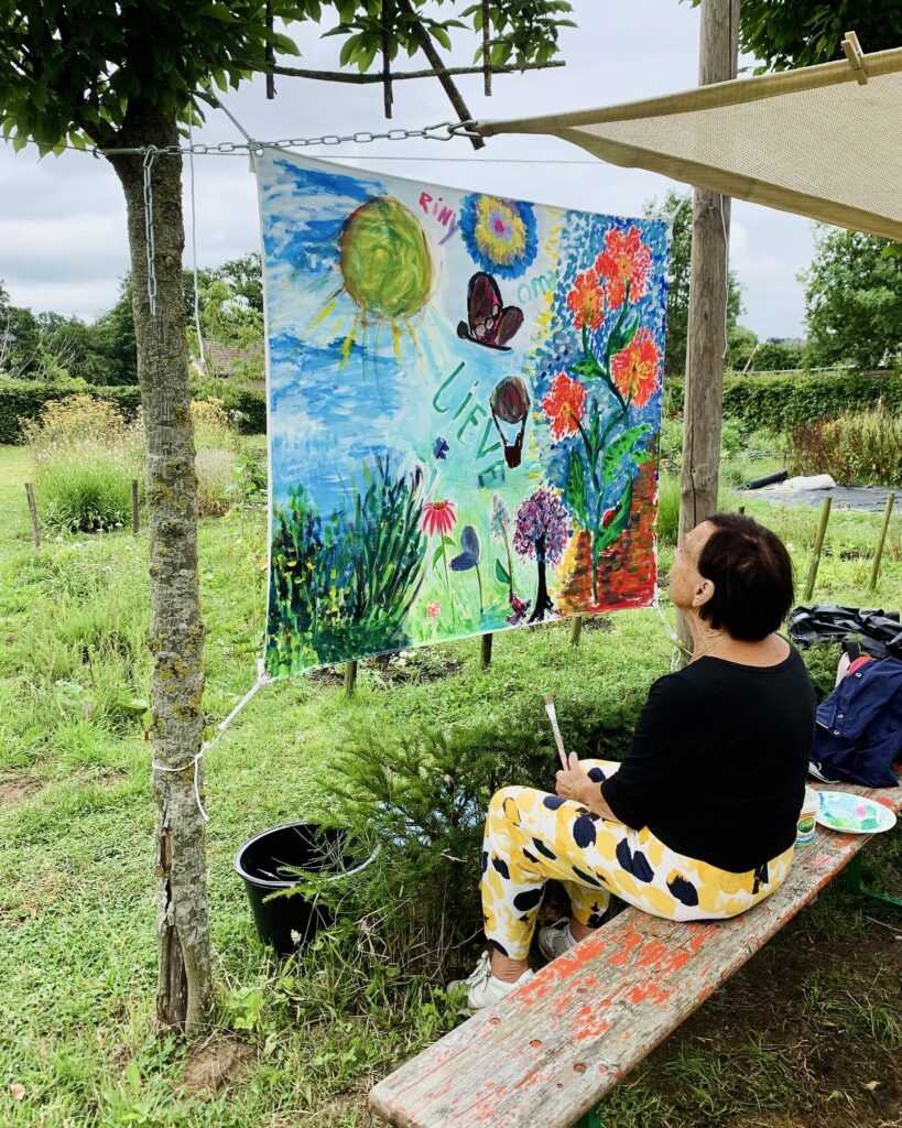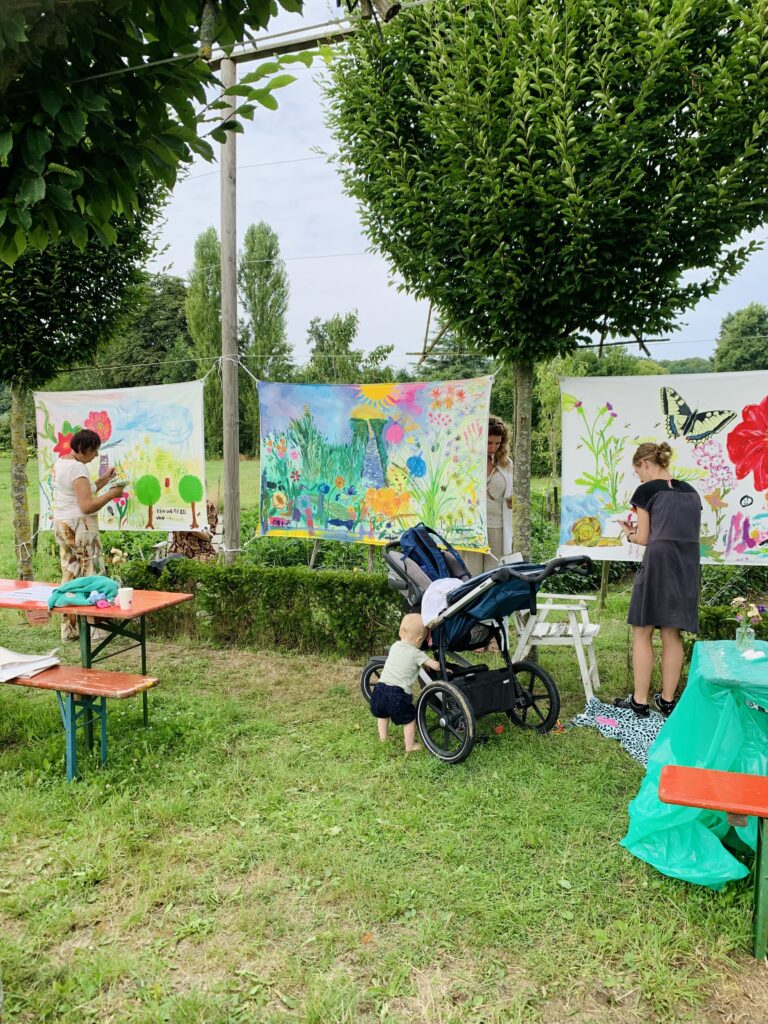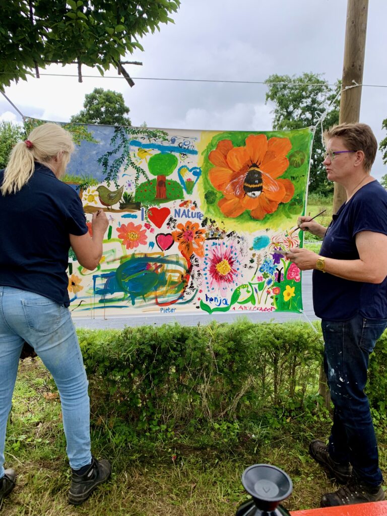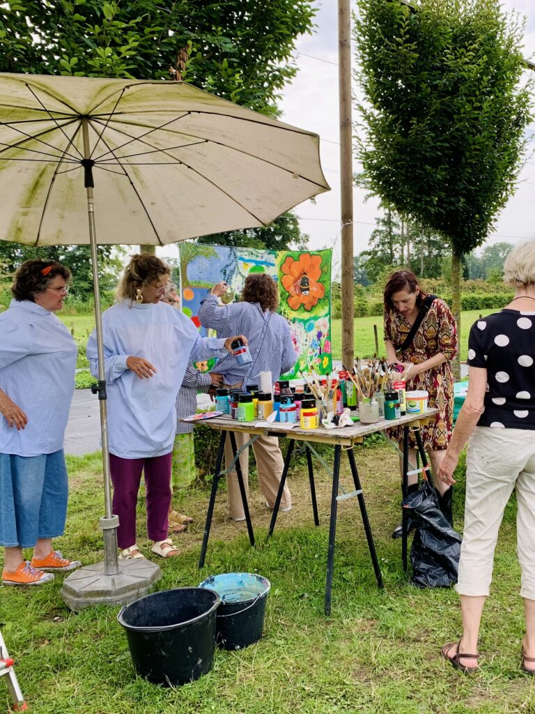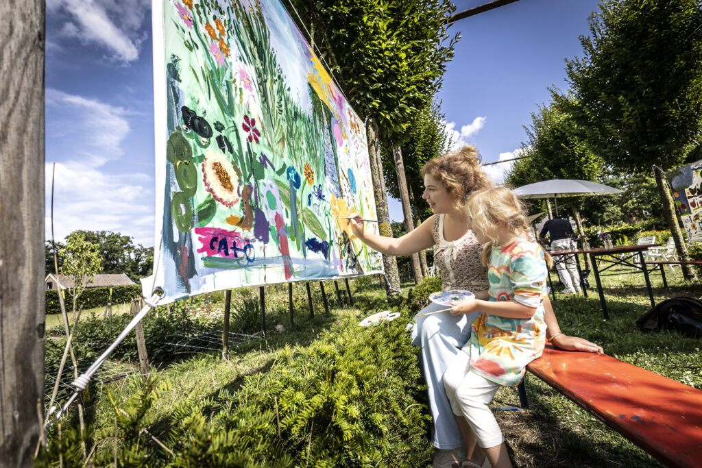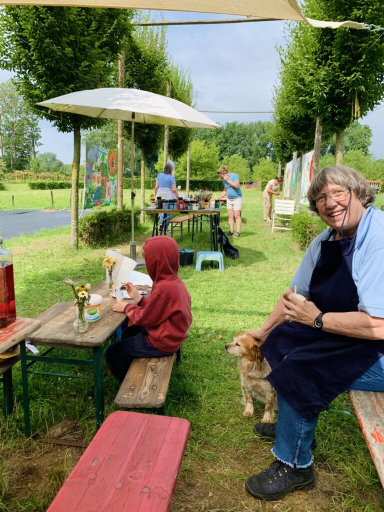 For three days, flower garden Volvelds in Laag-Keppel was transformed into an open-air studio: everyone was welcome to participate in painting freely on the ten canvases stretched between the trees. Both the fronts and backs of the canvases were painted. Children found flowers in the garden and painted their versions of it, residents of the nearby nursing home picked up a brush, families relaxed in the grass or at one of the picnic tables, people took a break with coffee and cake, chatted with each other and then painted along. The chickens occasionally dropped by and became part of the artwork. It were sunny and inspiring days with wonderful encounters, stories, and abundant creativity. More than 150 people visited and participated in this initiative called ‘Coloring Our World’. I received financial support for this project from the VSBfonds and Amphion Cultuurbedrijf.