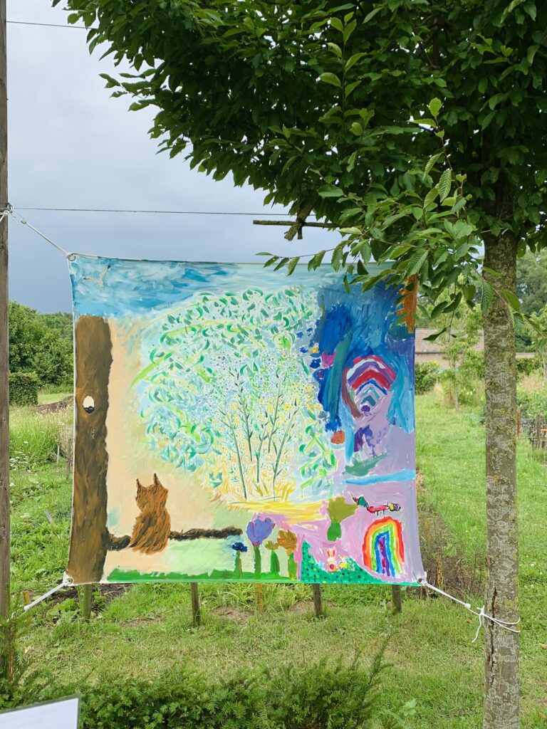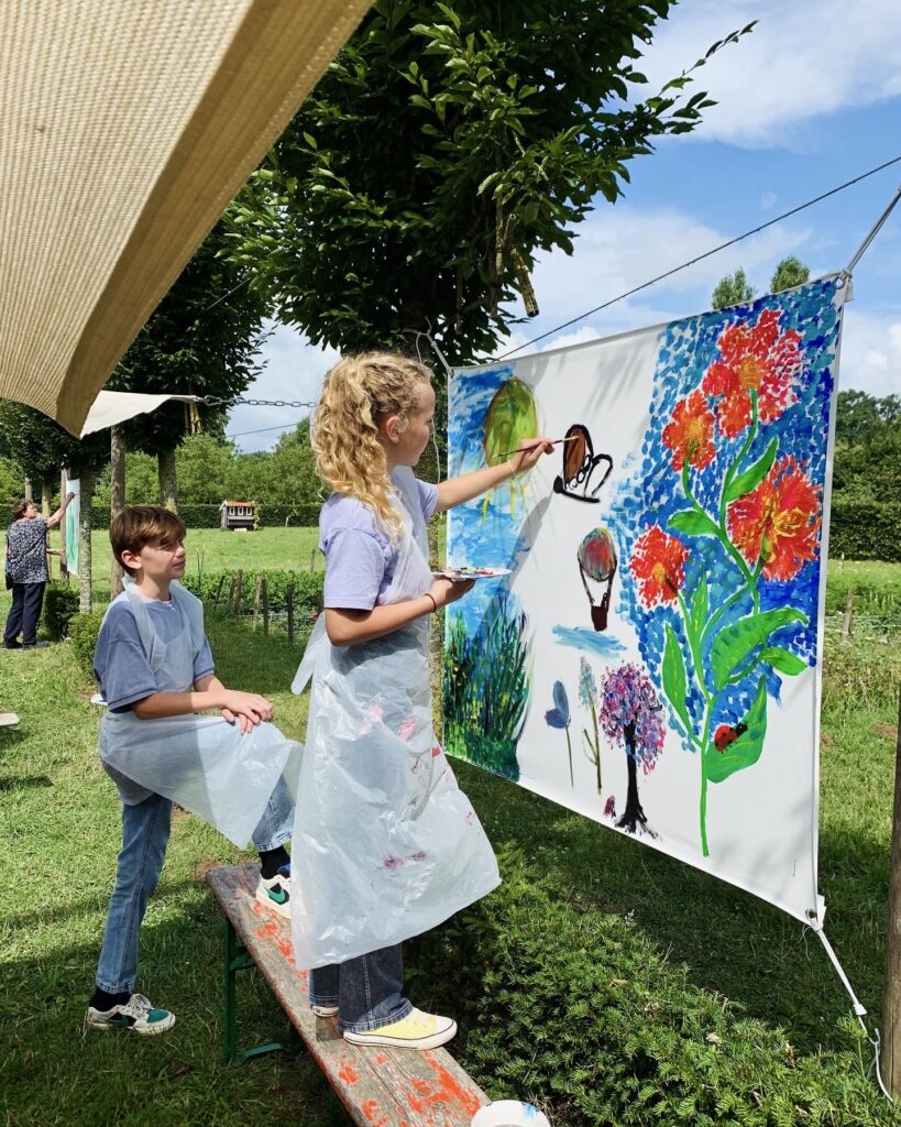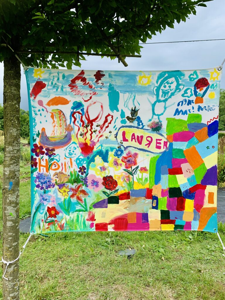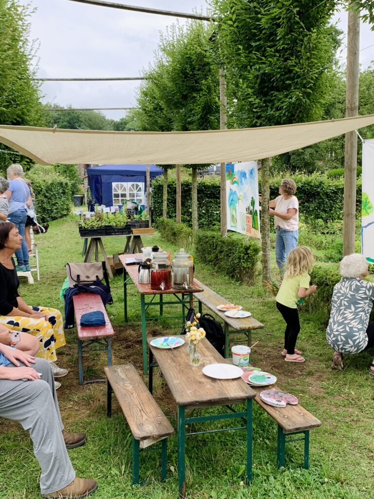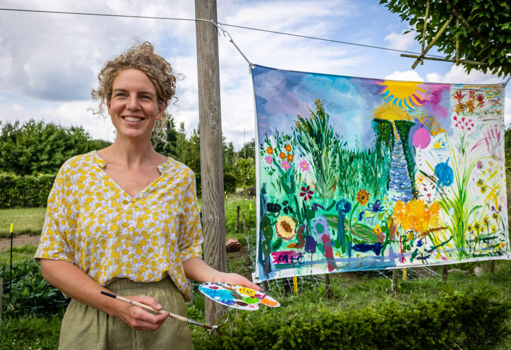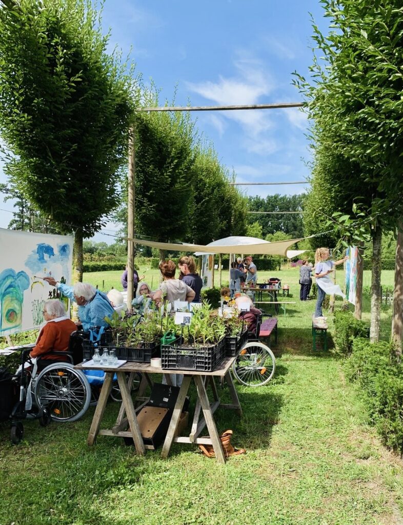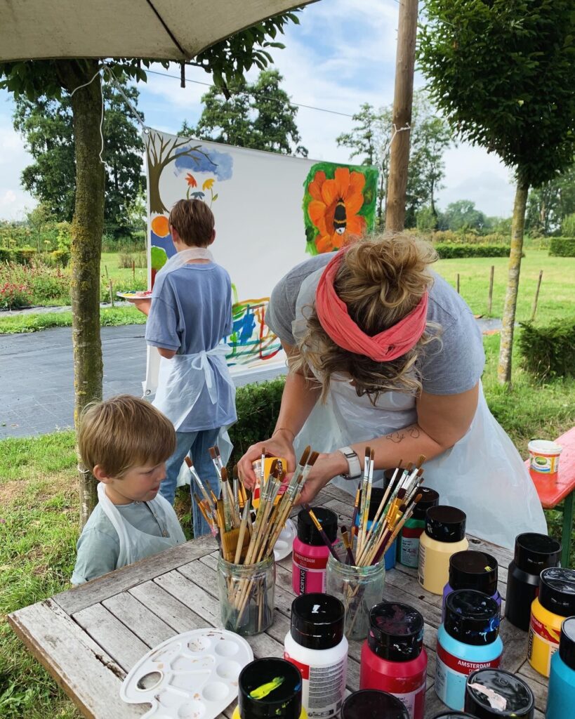 For three days, flower garden Volvelds in Laag-Keppel was transformed into an open-air studio: everyone was welcome to participate in painting freely on the ten canvases stretched between the trees. Both the fronts and backs of the canvases were painted. Children found flowers in the garden and painted their versions of it, residents of the nearby nursing home picked up a brush, families relaxed in the grass or at one of the picnic tables, people took a break with coffee and cake, chatted with each other and then painted along. The chickens occasionally dropped by and became part of the artwork. It were sunny and inspiring days with wonderful encounters, stories, and abundant creativity. More than 150 people visited and participated in this initiative called ‘Coloring Our World’. I received financial support for this project from the VSBfonds and Amphion Cultuurbedrijf.